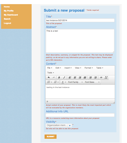 When you click on an organization, you will be taken to a "Submit a new proposal" page. Please fill out all the required information in as much detail as possible.