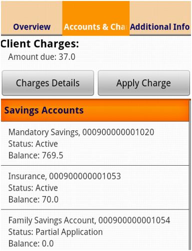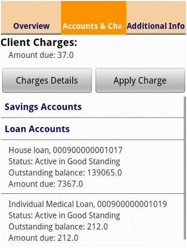 Clients and Groups may have one (or more) loan or savings accounts whereas Centers can have only savings accounts. You may display all accounts belonging to a customer from Accounts & Charges screen. To do that, select an account from the list and click on its name.