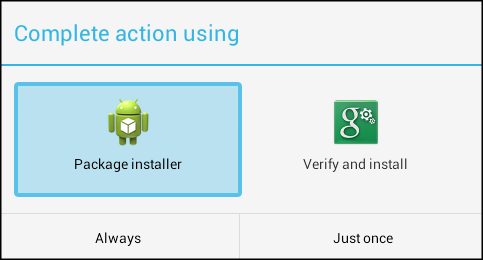 Using either of the ways above, click on the name of the downloaded .apk file, in this case to start the installation process. You will be given a choice on how to install the application. Select Package installer and click on Just once.