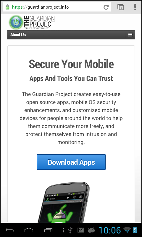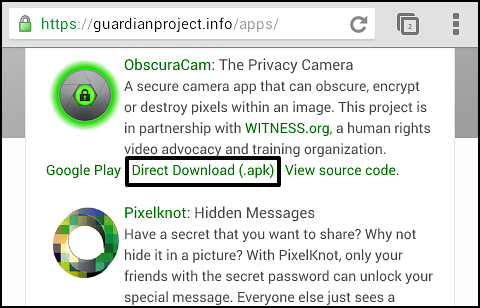 Click on the Download Apps link. This takes you to a page where you can find out more about the apps offered by the Guardian Project and lists a few different ways of installing them. Scroll down the page until you see the details for ObscuraCam and click on the Direct Download (.apk) link.