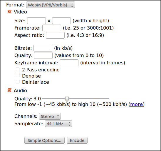 Firefogg is an open source, GPL-licensed Firefox extension for encoding Ogg video and WebM video files. It's simple to use, especially if you are already using the Firefox browser. FireFogg is an extension for Firefox and you won't have to download and install a separate application. Just install the extension and encode your video in Firefox!