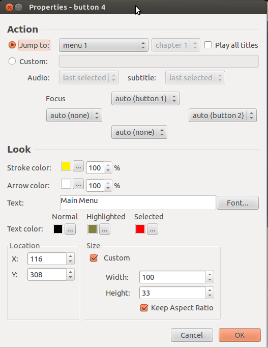 To use the arrow for going back to our main menu (Menu 1) choose "Jump to: menu1". To change the text in the arrow just give it your prefered title in the "Text" field. changing the size of the arrow have a look at the lower part of the window and change the width and height field to your desired size but keep in mind that the size of the text is changing as well.