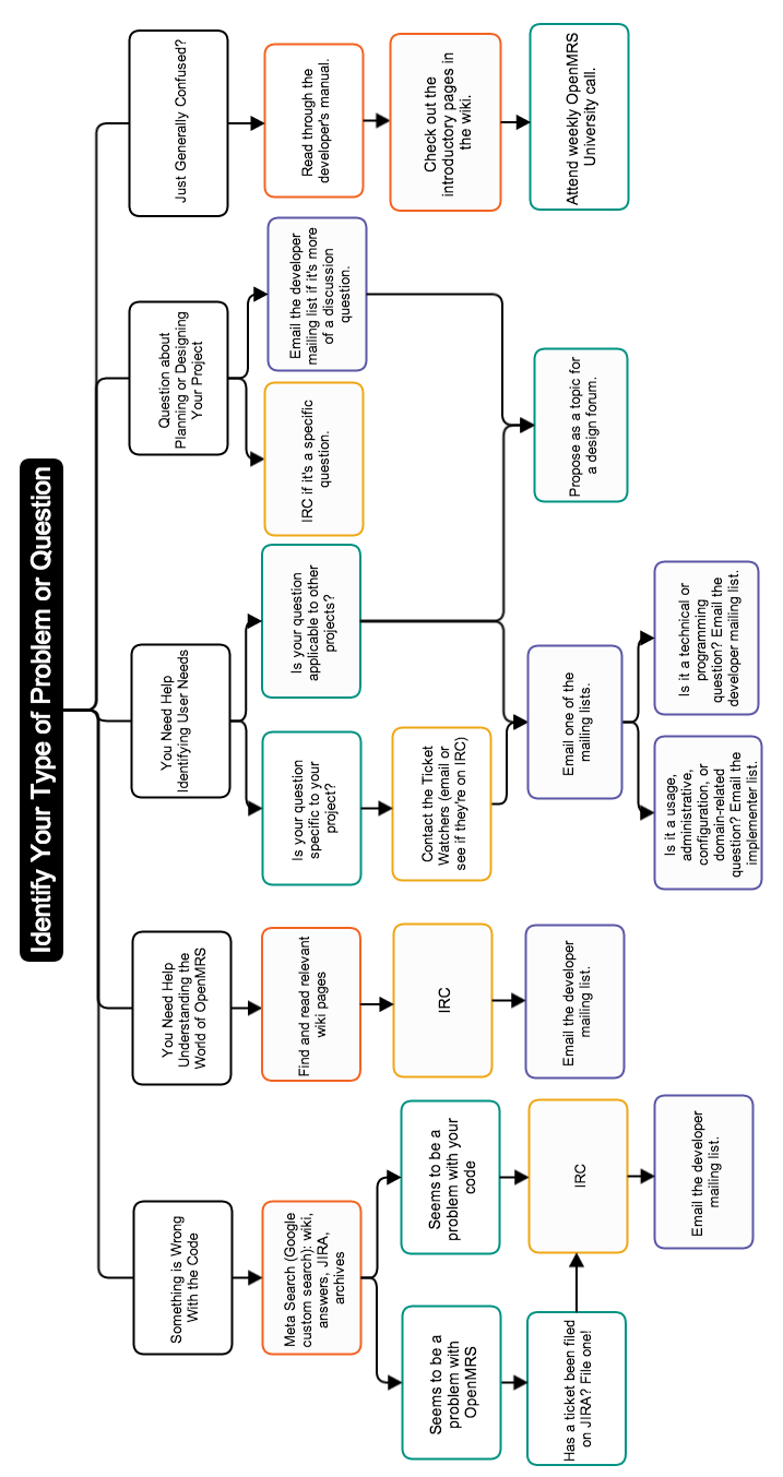 This section is a map of when and where to go for help, and how to get the most helpful feedback. Try to solve the problem on your own first. Regardless of your success, this little bit of research will help you ask more informed questions. When you can't find an answer in the OpenMRS documentation or on the web, you're ready to reach out for help. Start with IRC. From there, if you have a straightforward question in mind, you probably want to ask on OpenMRS Answers. If you can anticipate a variety of opinions or may have stumbled upon an unexplored OpenMRS issue, send an email to our developers mailing list. If your question has more to do with your users, find them on the ticket or on our implementers mailing list.
