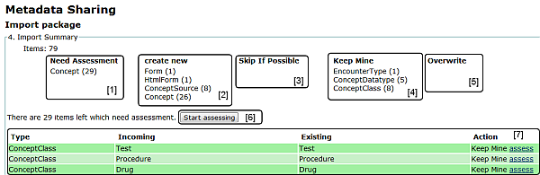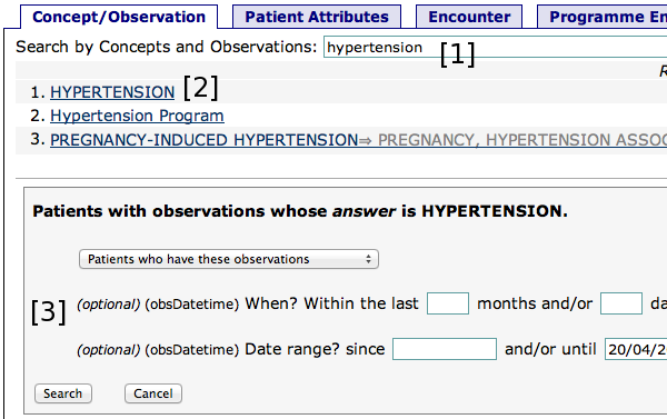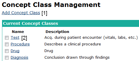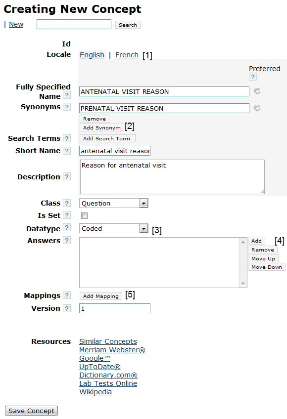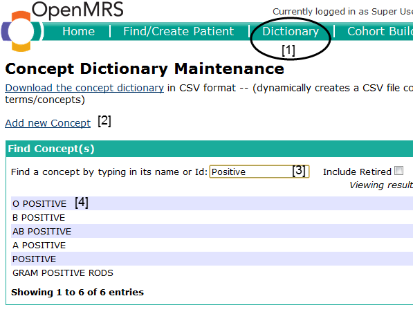 concept dictionary: A list of all the medical and program-related terms used in OpenMRS as questions and answers.