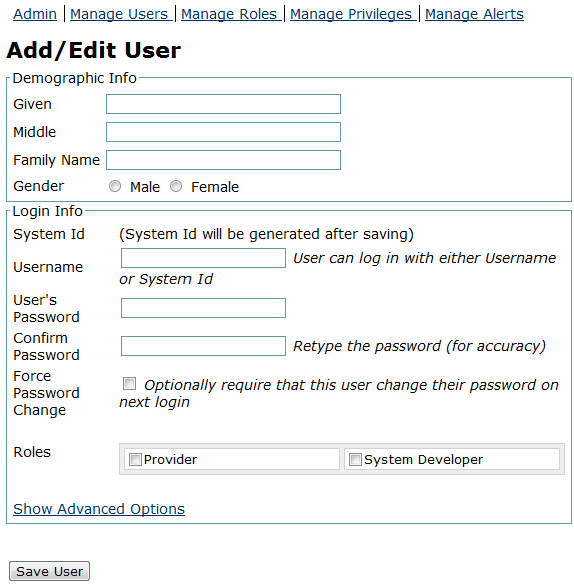 In both cases you will be taken to the same Add/Edit User screen. (If you selected an existing person, the fields in the Demographic Info section will be filled out for you.)