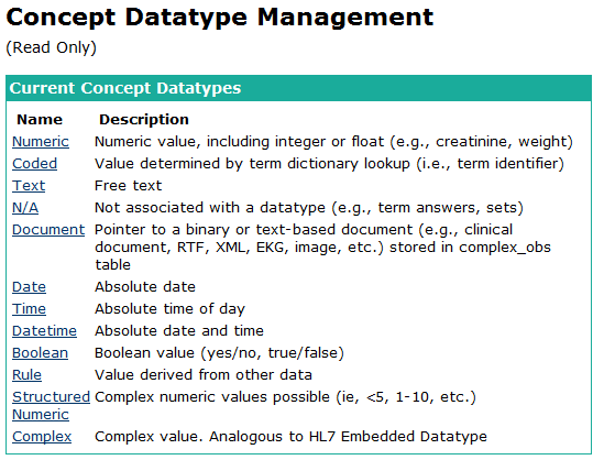 concept datatype: A descriptor of the type of data which a given OpenMRS Concept describes (e.g., numeric, text, etc.).