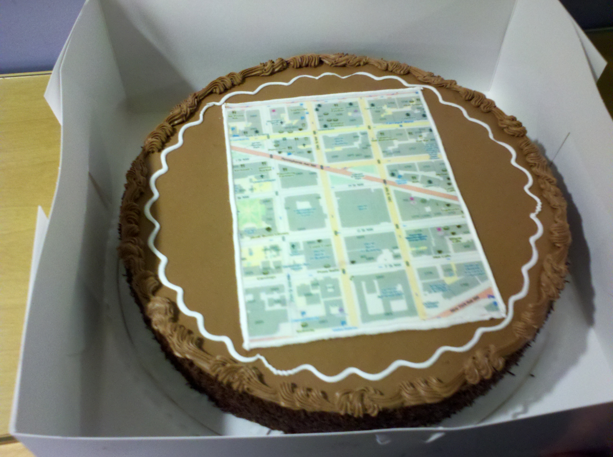 At many of these types of events it is common to create an actual map cake. The tradition of the map cake comes from an idea introduced by Iván Sánchez Ortega from the Spanish OpenStreetMap community. The idea is that if your data license is truly open, then it is perfectly reasonable to take the geographic data, print it on a cake and then consume that cake, without breaking any licensing rules. This has lead to many cakes being made for social events all over the world! Below is a map cake from a mapping party held at the World Bank in Washington D.C.