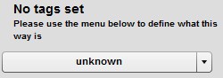 Tags are "key-value" pairs of strings optionally attached to each geographic element in OpenStreetMap. These tags describe the feature they are attached to, and can be any pair of strings up to a maximum of 255 characters in length (including spaces), with the only restriction that keys be unique inside one element. If there are no tags associated with a feature, most renderings of the data won't display that feature.