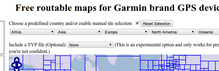 To begin, visit http://garmin.openstreetmap.nl/. You will be presented with a map of the world split into hundreds of rectangular areas and several drop downs listing the continents.