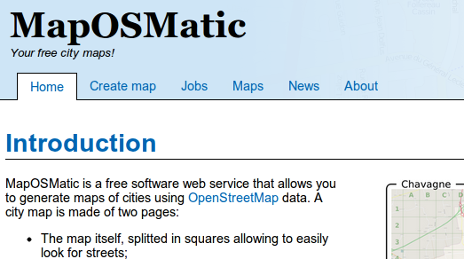To start, visit http://maposmatic.org/. You will be presented with a webpage giving an overview of the MapOSMatic website and a link to "Create a Map".
