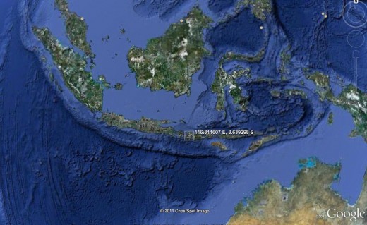 Google Earth software, showing coordinates of a place in Lombok, Indonesia