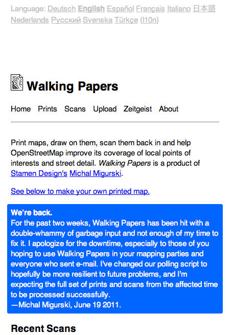 When you click Generate, a page showing the status of your requested map will appear and reload periodically, updating as your position in the queue changes. Eventually your map will render and a "Success" image will appear, indicating that your map is complete and ready for download. If your web browser stops reloading, or you close the page, you can go to http://maposmatic.org/jobs/ to see that status of existing maps, including yours. Once completed, your map will come in two pieces: a map page and an index page. Each of these can be downloaded in PNG, SVG, or PDF format to make it easier to print.