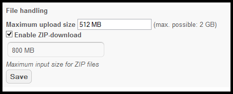 The Enabled ZIP-download is activated because it is Needed for multi-file and folder downloads. Entering 0MB in this field means that users can download unlimited data.
