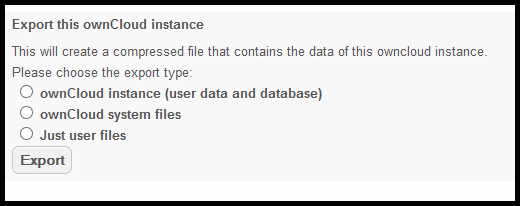 The next item – Export this ownCloud instance – is very useful. An administrator can use this to migrate or backup data.