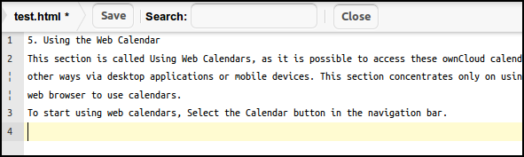 Unlike Google docs or blogging software, there is no WYSIWIG (for formatting) in ownCloud so creating a text file is simply a matter of giving it a name, opening it and entering text. There is also the option to Search the text.