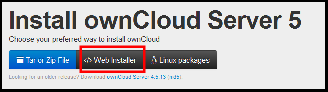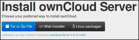 The list of three options link to instructions on installing ownCloud manually (downloading the Tar or Zip File), the Web Installer and installing ownCloud using distribution specific packages.