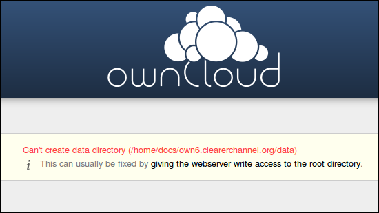 When we point our browser to the URL that we have linked to this web directory we will see an error that we need to fix. Cannot create data directory (/path/to/owncloud/)