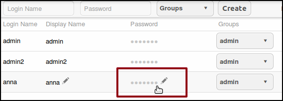 Click in the Password field for the relevant user and enter a new password. Admins can also change the Groups users are in.