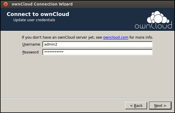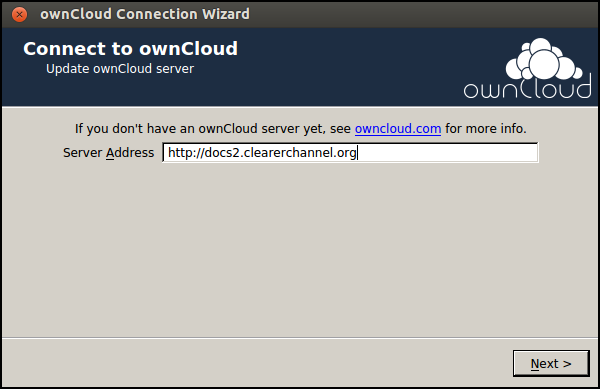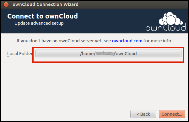 Note: if the wizard doesn't start, read on to configure it in a different way.When the the ownCloud wizard starts follow these steps: