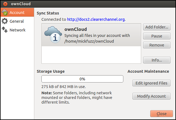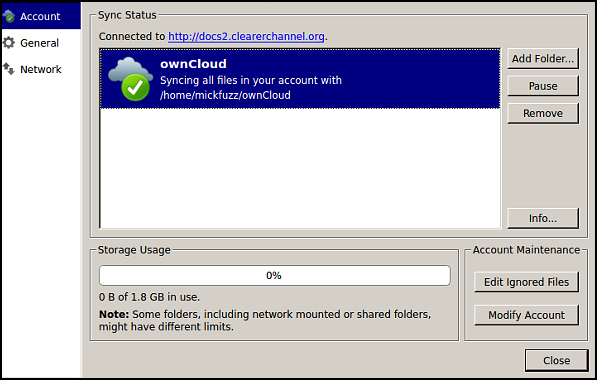 The ownCloud client is a good way to have more control over the way files are synchronized between your ownCloud server on the web and your computer. This can be helpful if a simple WebDAV set up isn't performing as it should or if you want to take advantage of the extra settings the ownCloud client gives you. These include limiting the bandwidth used, viewing the space allocated and used, and setting certain files and folders to be ignored during the syncing process.