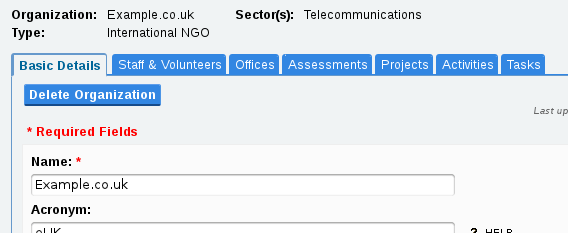 This shows the "Organization" resource, with its components as navigation tabs. Each tab handles a set of records in a different database table. All the records in all of the tabs together form the "Organization" resource.