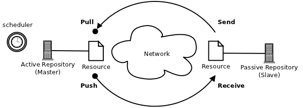 The active Eden instance runs the scheduler process, and initiates the update requests when they are due, while the passive repository (slave instance) merely responds to these requests.