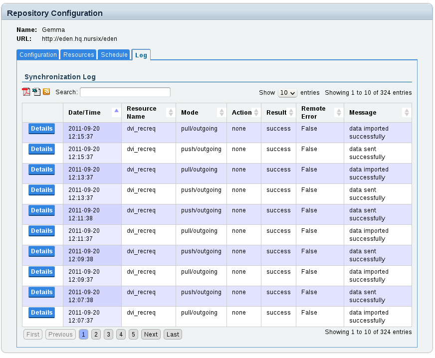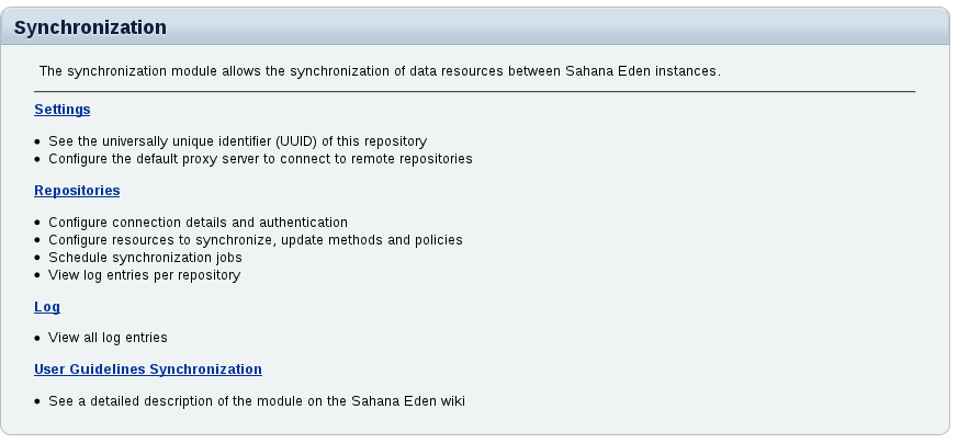 The Synchronization module allows the synchronization of data resources between Sahana Eden instances. Synchronization jobs can be configured to be run automatically in the background and at regular intervals, without disrupting the current operation of the sites.
