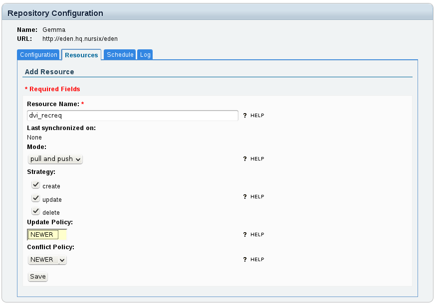 Go to the Synchronization Homepage, click Repositories, then Open the repository you want to configure a resource for, and change to the Resources tab: