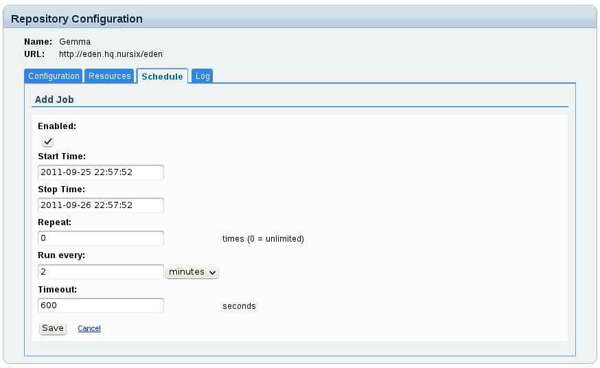 Go to the Synchronization Homepage, click Repositories, then Open the repository configuration you want to schedule a synchronization job for and change to the Schedule tab. If there are already jobs configured for this repository, you will see a list of those jobs. Otherwise (or by clicking Add Job), you get to this form: