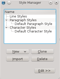 The Style Manager consists of two main parts. When you initially open it with Edit > Styles from the menu, you see this smaller part shown above, where you may select a style and act upon it (Edit), or create a new one (New).