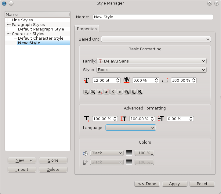 In case you might import text from ODT or HTML formats, you will likely see that some new styles appear in your list. You may want to check these styles and adjust as needed, or you may find you can substitute some style you have created, then delete them.
