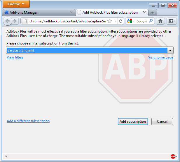 Which filter subscription should you choose? Adblock Plus offers a few in its dropdown menu and you may wish to learn about the strengths of each. A good filter to start protecting your privacy is EasyList (also available at http://easylist.adblockplus.org/en).