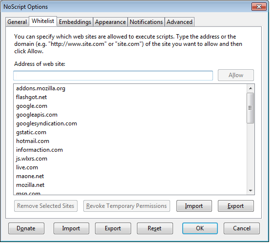 Alternatively, you can add domain names directly to the whitelist by clicking on the NoScript button, selecting Options and then clicking on the Whitelist tab.
