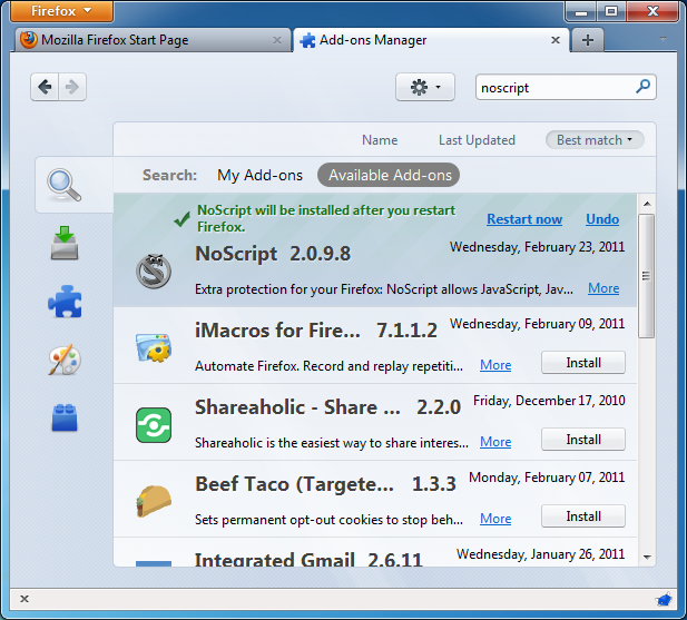 The NoScript extension takes browser protection further by globally blocking all JavaScript, Java and other executable content that could load from a Web site and run on your computer. To tell NoScript to ignore specific sites, you need to add them to a whitelist. This may sound tedious, but NoScript does a good job in protecting Internet users from several threats such as cross-site scripting (when attackers place malicious code from one site in another site) and clickjacking (when clicking on an innocuous object on a page reveals confidential information or allows the attacker to take control of your computer). To get NoScript, visit http://addons.mozilla.org or http://noscript.net/getit.