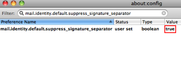 The preference also provides a way to always add the signature separator. Using the Configuration Console as mentioned above, you can set the preference to "true" and manually add "-- " (dash, dash, space) separators to your signature. While this makes it consistent, quotes become part of your signature and are removed when you reply to them.