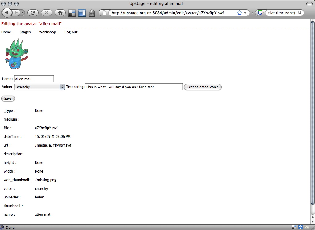 For the UpStage Open Server, 8084, players can log in at http://upstage.org.nz:8084 or at http://upstage.org.nz:8084/admin. Once logged in they will find themselves in the Foyer, a customisable landing page that provides links to existing stages and to the media management tools.