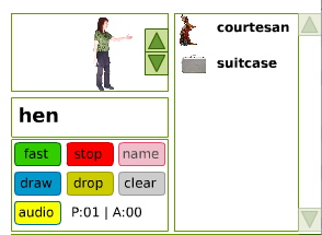 Click on the yellow "audio" button to reveal the Audio Palette. Audio files assigned to the stage will appear in a list on the right, with musical notes indicating music tracks and "sfx" indicating sound effects. Use the green arrows to scroll up and down if there are more than six tracks assigned to the stage.