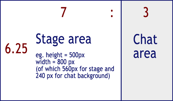 The audience view of the stage is shown below: the text chat window is at the right, with an input field at the bottom and up-down scroll arrows on the right top and bottom corners. Above the text chat window, a counter shows how many players and audience members are on the stage. The rest of the screen is the "stage" where the visual action of the performance takes place.