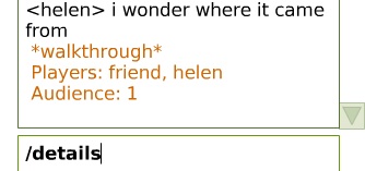 The screengrab above, from West Side's Story (101010 UpStage Festival) shows audience and player text in the chat.