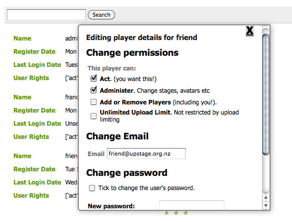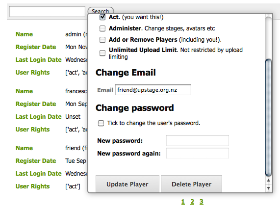 From time to time, you may need to edit the details of a player other than yourself - for example if someone's email address has changed but they haven't updated it themselves, or if you wish to give someone extra permissions such as an unlimited upload limit. The most common example is when a player has forgotten their password - an admin player can create a new password for them so that they can log back in.
