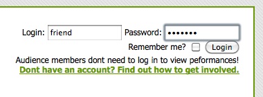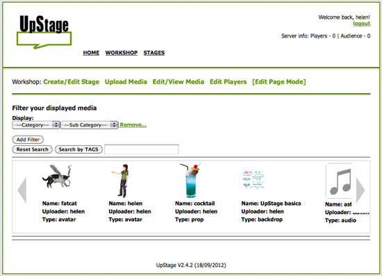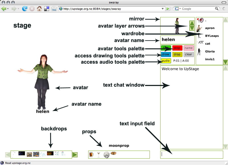 Audience members enter UpStage by following a web link from an email or web page; they do not need to download or install any additional software as long as they have a browser with the Flash player plug-in1. Audience members do not log in, and do not have access to the on-stage tools used by the players.