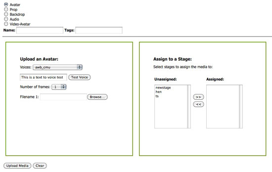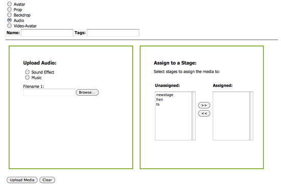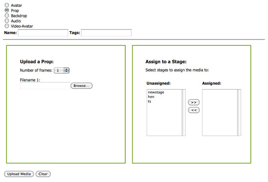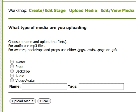 When you click on the radio button for the type of media you want to upload (Avatar, Prop, etc) the screen will expand to provide the upload form.
