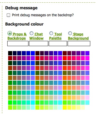 Here you can select background colours for different areas of your stage: the chat window, the tool palette, the props and backdrops bars and the entire stage. Click on the radio button for the area whose colour you wish to change, then select from the colour palette. The chosen colour will be displayed in the box under the name of the area.