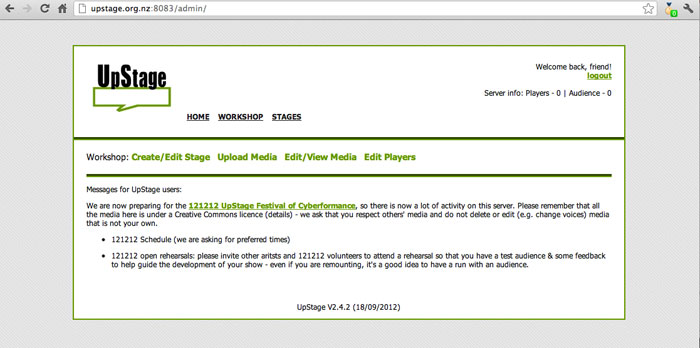 At the end of 2010, former AUT student Paul Rohrlach joined the team as a developer and server administrator and in 2011 Francesco Buonaiuto became our volunteer documenter. Many other artists are involved in the annual UpStage Festival, and we have a growing team of open source developers who are supporting the maintenance and development of the software.