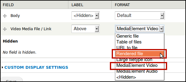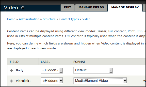 To display the video, we need to choose different options in the Manage Display tab of our File field.