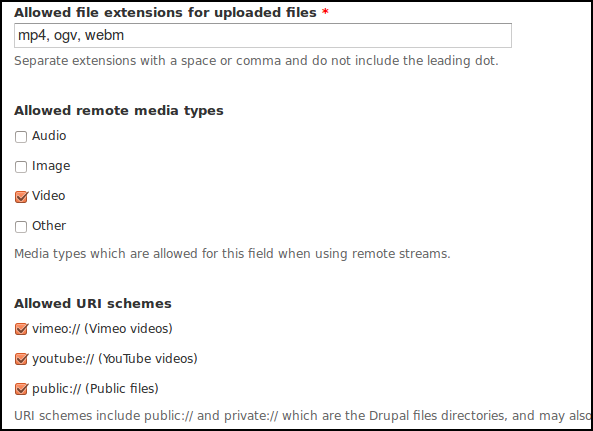 Configure file types allowed for uploaded video, select Video for Allowed remote media type, select Youtube and Vimeo, and enter other details like max file size.