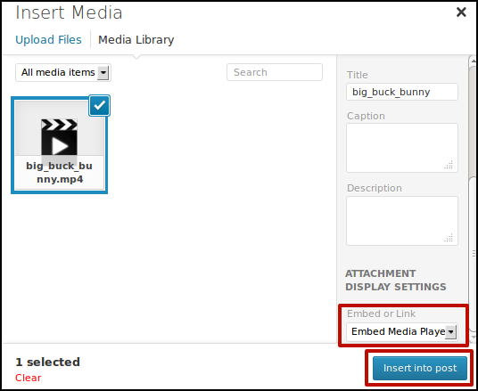 Choose Embed Media Player from drop-down menu, then click on Insert into Post.