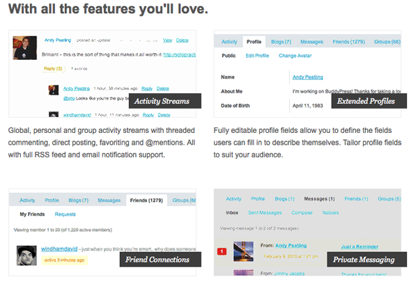 For a full breakdown of the features of BuddyPress you can visit the project's home page. 1 Some of the most notable and useful features are: Activity Streams, Extended Profiles, Friend Connections, Private Messages, Private Messaging, Groups and Discussion Forums.
