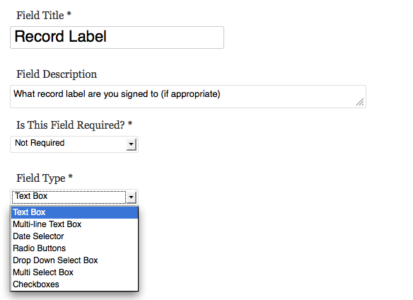 You can set the name and description of a field and choose what kind of field you want it to be: Text Box, Date Selector, Radio Buttons, Drop Down Select Box, Multi Select Box or Check Boxes.