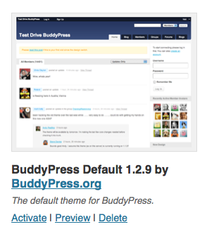 BuddyPress is ready. You'll need to activate a BuddyPress compatible theme to take advantage of all of the features. We've bundled a default theme, but you can always install some other compatible themes or upgrade your existing WordPress theme.